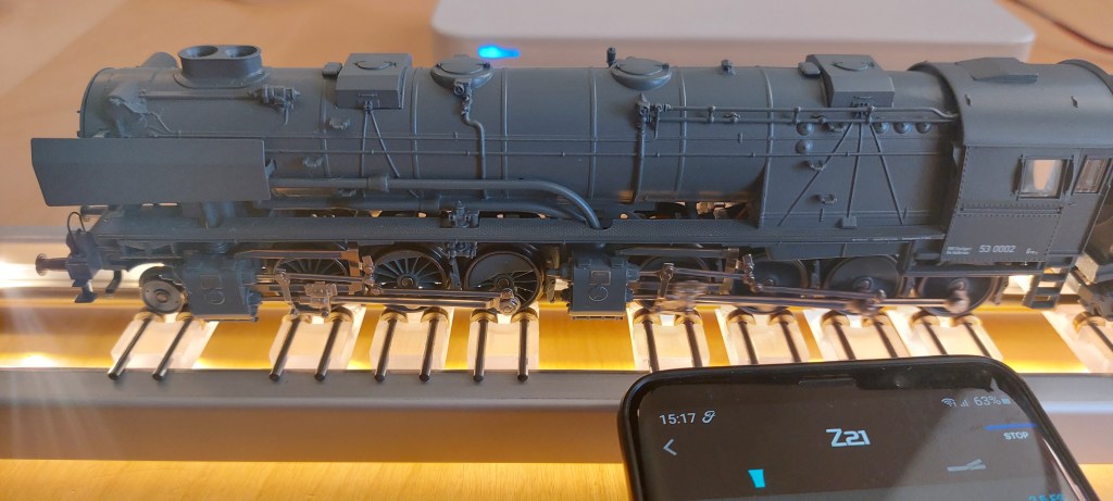 I placed my BR 53 on the rolling test stand, which is connected to my z21 control center, open the Z21 app and powered up the throttle. The result was amazing. The driving wheels turned slowly and picked up speed as I throttled up.