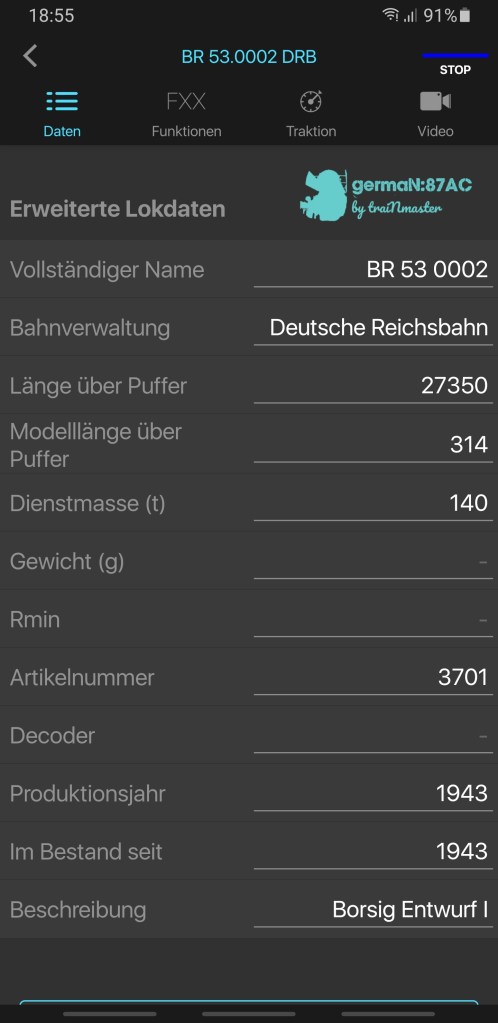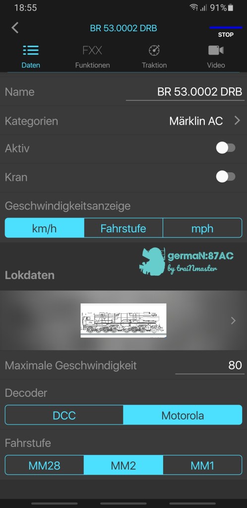 On the Z21 app, you can add a Märklin loco and its data and characteristics, as I have done for my BR 53 0002 DRG. Remember to choose Motorola decoder.