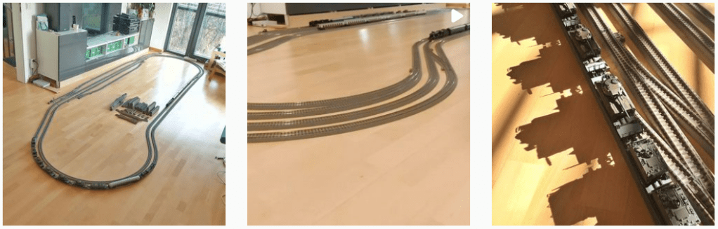 Whatever you want to call it – floor (dt. Boden), carpet (dt. Teppich) or parquet (dt. Parkett) layout, it provides an alternative to a typical “above ground level” layout – be it modular or non-modular, permanent or mobile. You basically set it up on the floor, run your trains and pack up at the end of the day. The track configuration can vary each time. The advent of snap tracks such as Märklin/Trix C-tracks, Roco geoLine, Roco-Line with bedding. Fleischmann Profi-Tracks, Atlas True-Tracks, Bachmann Trains E-Z tracks. Kato Unitrack, etc. AND wireless app-based throttles made it possible to setup such layout without much space constraints.