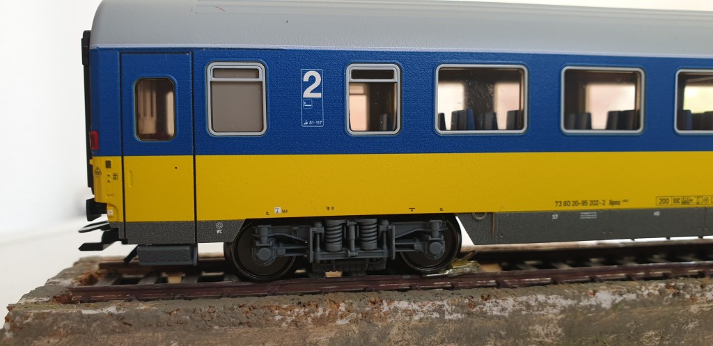 The special second-class passenger/donation car (Type Bpmz 293.2 open seating car) comes in Ukraine flag (blue/yellow) livery and the white peace dove.