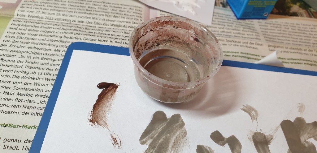I used a mixture of middle light gray, amber brown and thinner in the following ratio 1 : 0.5 : 3. This creates a diluted concrete color with tints of brown. I put a drop of amber brown on the side.