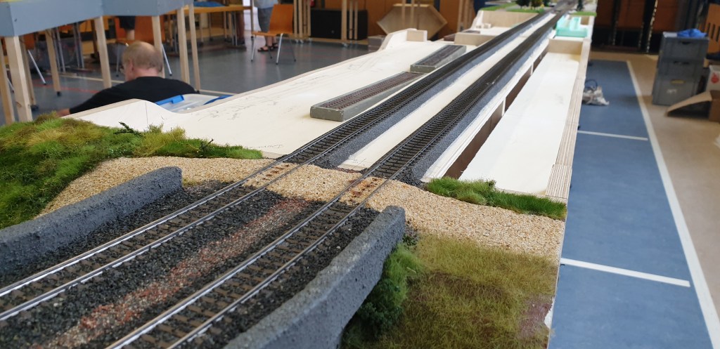 Commissioning and Integration is successfully completed. Club acceptance test passed. The modules are now internally designated “Bahnpark 1” (aka Module 1a) and “Bahnpark 2” (aka Module 1b). Although I treat the two modules as one unit, the club event planner maintains the right to select 1 or 2 modules for an operating session depending on the available hall space and number of participating members. Therefore, my modules should be separable when needed.