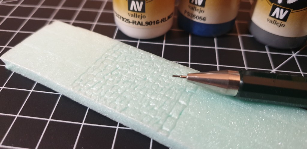 Extruded styrofoam (XPS / Styrodur) is an easier material to work with then expanded styrofoam (EPS / Styropor), which are the white, beaded foam that comes in electrical device packaging. XPS is used for building insulation and comes in densed foam. Lightly carve out each stone on the XPS.