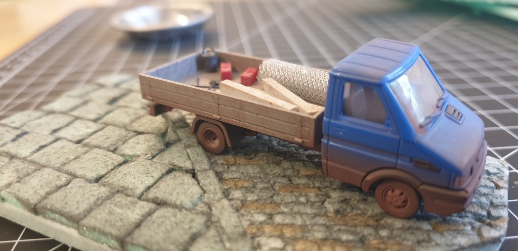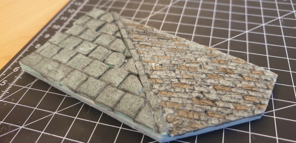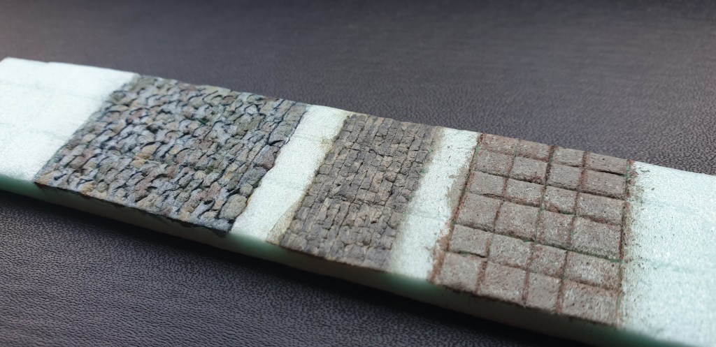 With Vallejo Model Air paints, I brought the carved cobblestone to live. On this test piece, I tried out various sizes of cobblestone and concrete pavement.