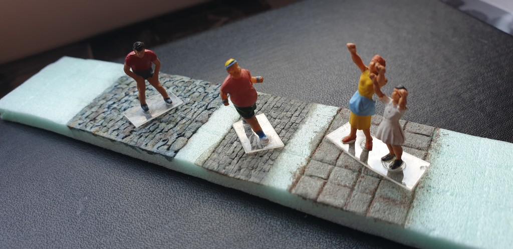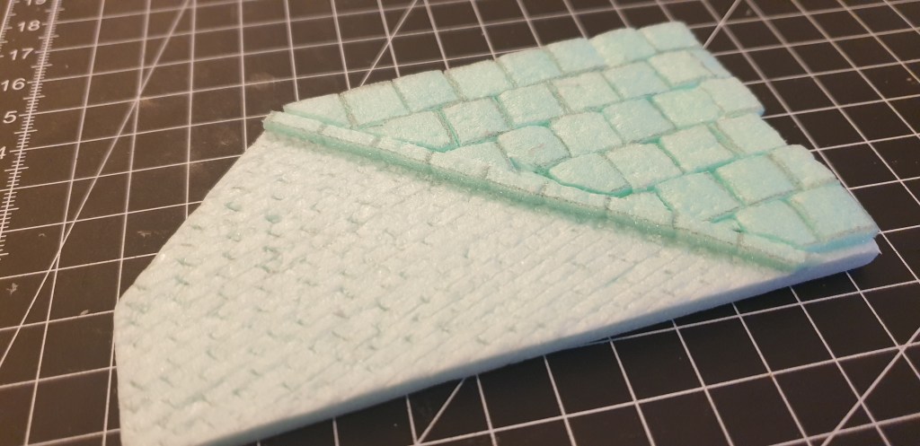 Happy with the results, I proceeded making a section of a road, combining cobblestone road and concrete pavement. The cobblestone are carved directly on the XPS whereas the pavement is individually laid. I used a wooden tool to create rough texture on the road and pavement (alternatively use a crumpled ball of aluminium foil)