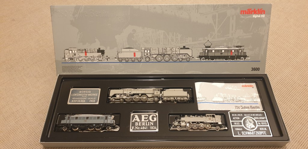 I have been observing this H0 set on Ebay for more than 1 year and finally bought a relatively new, never been run set. Märklin produced three types of this commemorative set in 1987 in conjunction with the 750 years founding of the city Berlin (1237-1987). Set 3100 is H0-analog while the above set 3600 is H0-Delta digital. Set 8887 is in Z-scale.