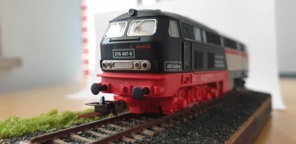 I recently received a customised order for a colleague’s farewell gift. He worked at DB Fahrzeuginstandhaltung GmbH (DB FZI) and is also a HO-scale DCC model railway fan. So I proposed a Piko BR 218 497-6 in unique DB FZI Cottbus black (sream locomotitve) and white (ICE) livery (article no. Piko 57401). The model is a DCC version with sound. This special edition was produced by Piko in partnership with Märklin (Märklin produced the AC, DC (Z-scale and in Minitrix N-scale)