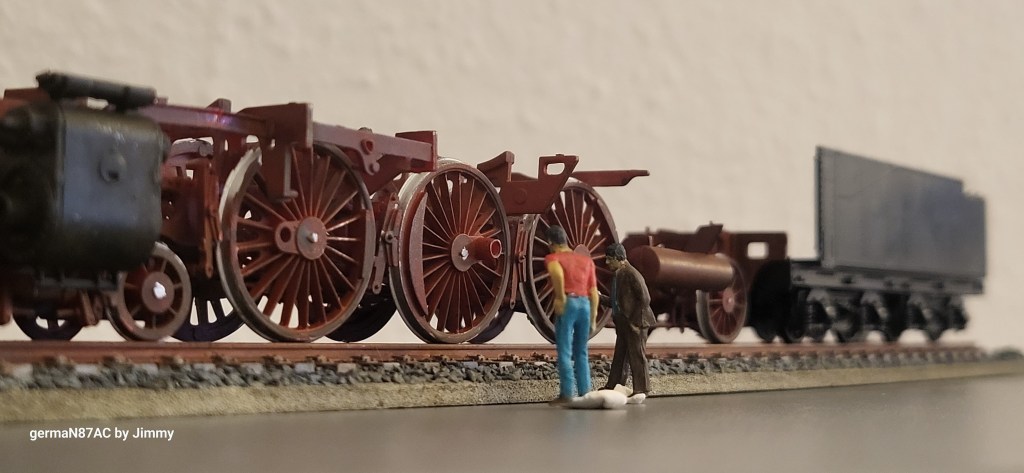With the undercarriage frame completed, it is time to give it a layer of paint. I applied Vallejo Surface Primer Black to coat the plastic for better paint adhesive. Then I airbrushed Vallejo Model Air Fire Red (note to self: DO NOT use black primer with warm colors such as red). Instead of red underframe, it turned out brown, which unexpectedly gave the rustic look. As this model is on an outdoor-display (versus the real-life loocomotive in York), this rustic look may in the end be the right tone. Sometimes, such “accidental mistake” maybe a blessing.