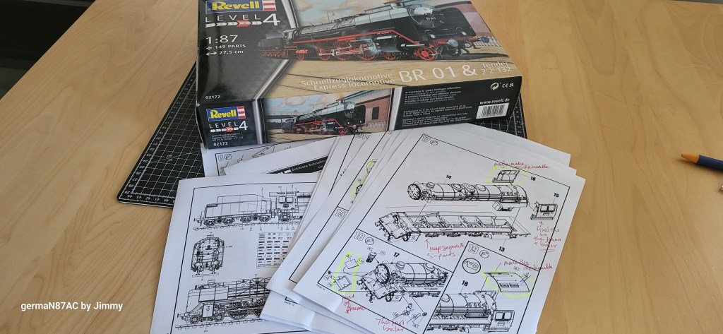 I was deciding whether to buy a pre-owned steam locomotive model from Märklin or Roco and cut them or use Revell kit. In the end, I went for the cheaper alternative but with fine details that I could work on. Unlike other modellers who follow the assembly instructions as per the kit, I had to meticulously plan which components to exclude from the final model and how to cut out the required section. You will notice lots of markings and remarks on the instruction sheets that require careful thought-through.