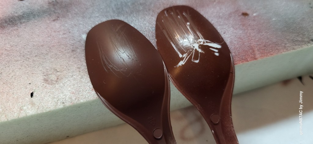 Airbrush modellers talked a lot about the need to prime your models before you start painting. So I did this simple test: two plastic spoons were primed with Vallejo Surface Primer black (left and right); the difference is the dilution with airbrush thinner. The left spoon 50 primer/50 thinner, while the one on the right 60 primer / 40 thinner.