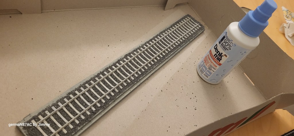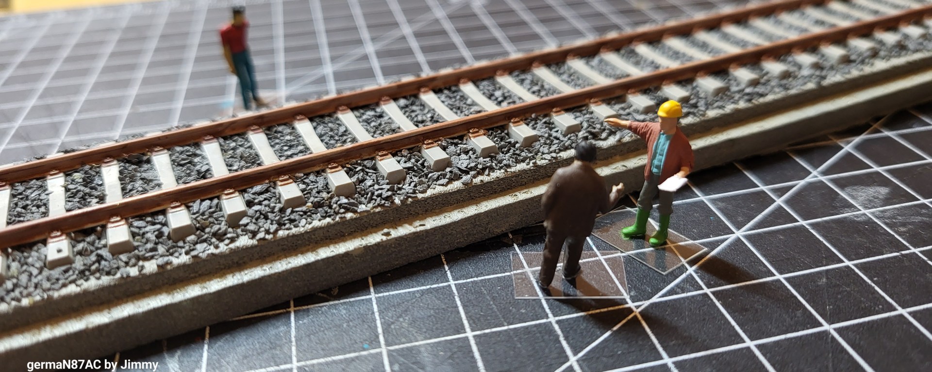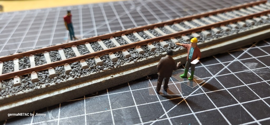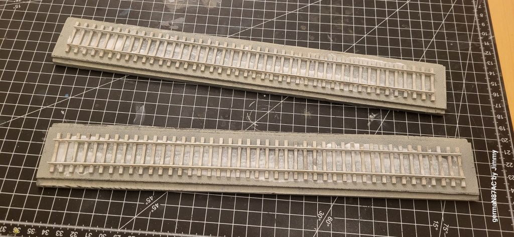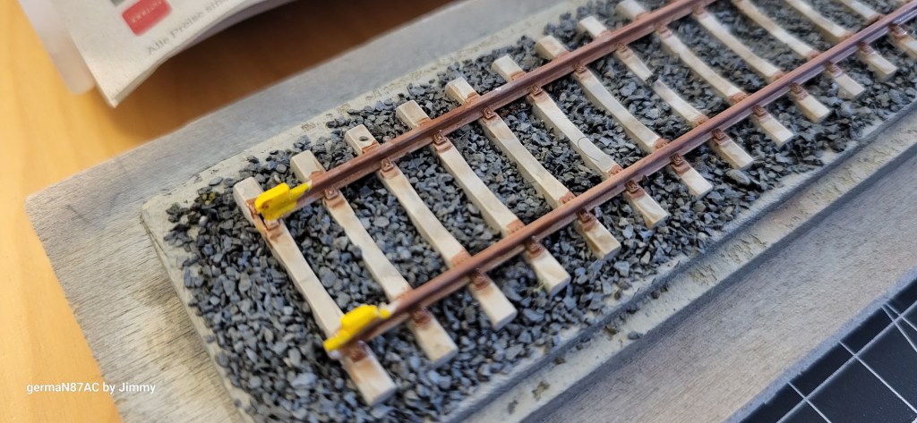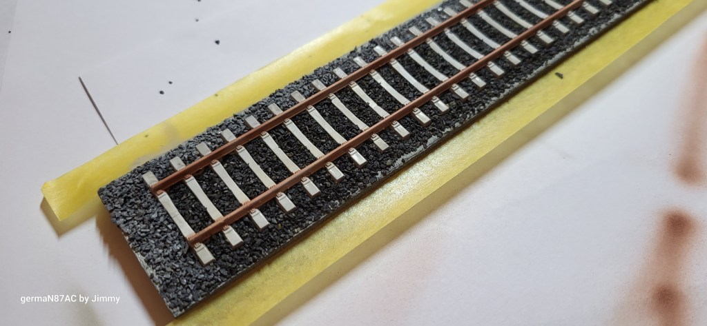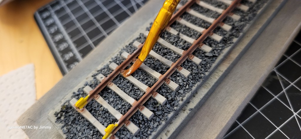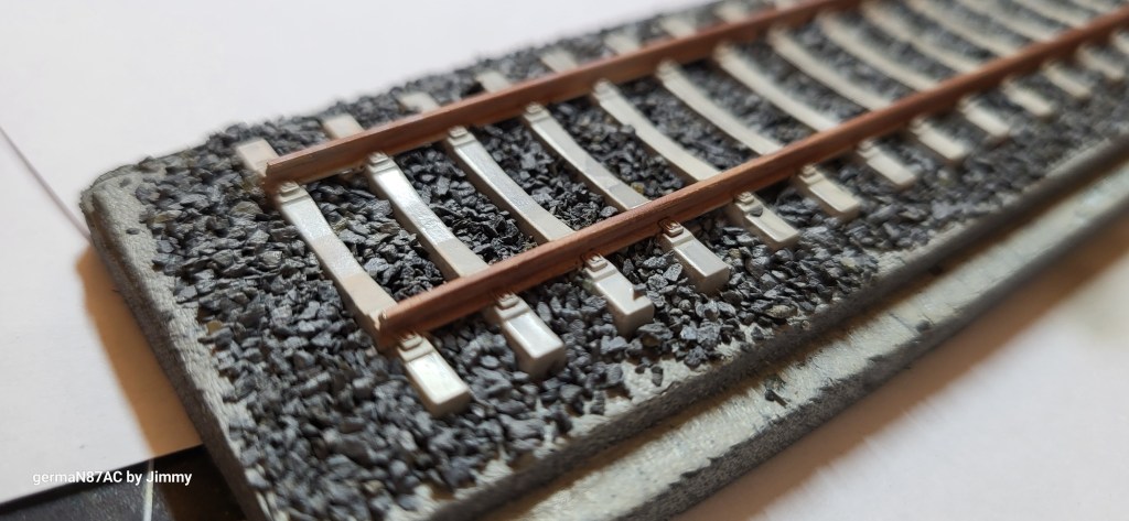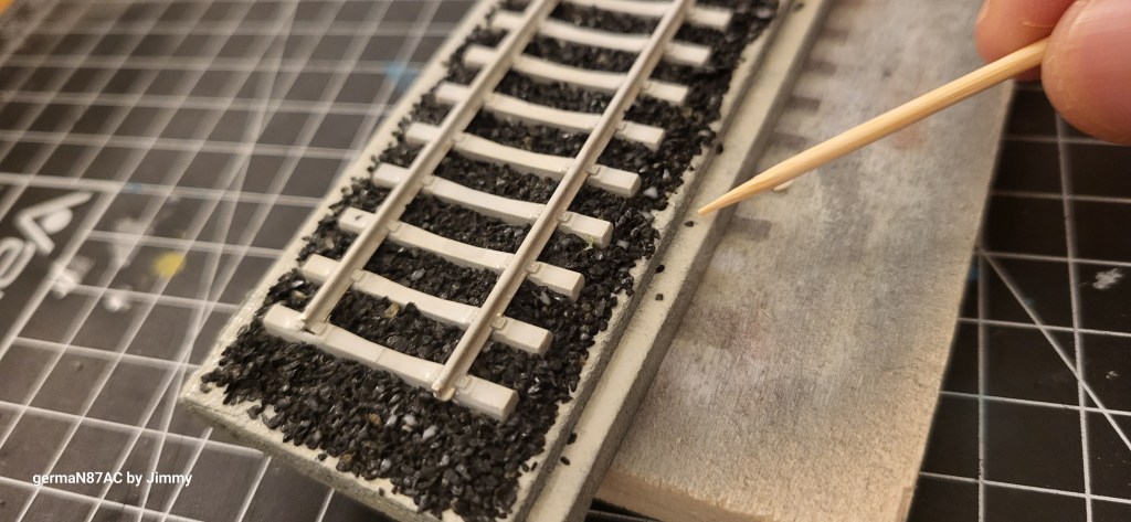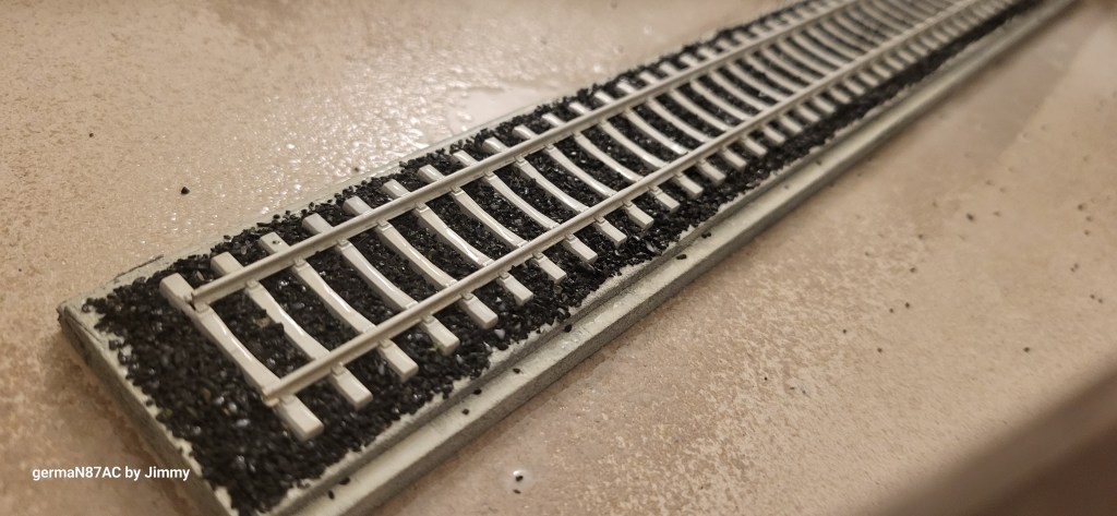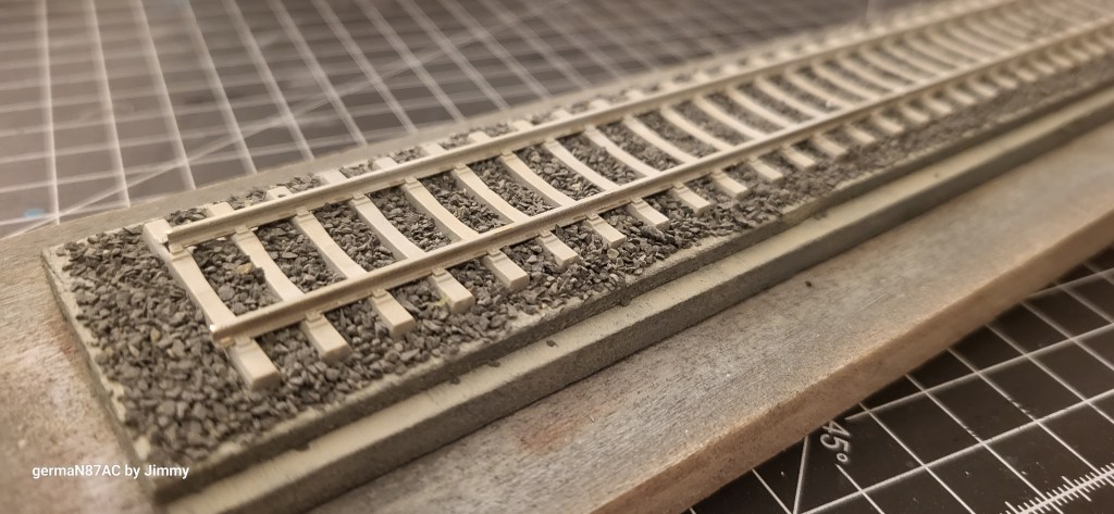 Once fully dried, I checked again for excess ballast that I do not on the sleepers, rail webs or on the foundation.