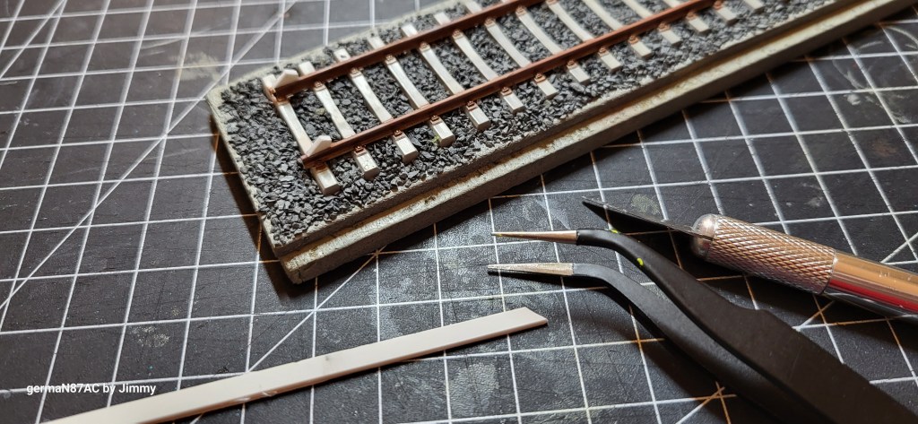 As the exhibition tracks are just “dead tracks” and to prevent rolling stocks from rolling off the tracks (sorry, no puns intended), I made these rail wheel blocks from a 1mm styrene strip. I cut the styrene strip into small triangle shapes and used superglue to bond them to each end of the tracks. Using a spruce cutter, I trimmed of the triangle and leaving about 1mm from the rail head.
