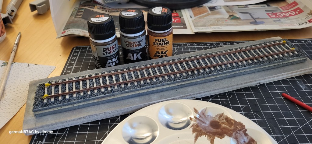 For the concrete sleepers especially those near the rail plates, I used rust streaks and fuel stains (AK025). I always used enamel thinners to “move” and wipe the streaks and stains around.