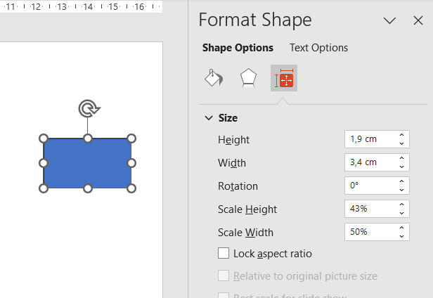 To create the exact measurement, I inserted a shape in the same PowerPoint slide. Right click on the shape, select “Size and Position”. Enter the measurements to create the exact rectangle that will be the shape of the styrene.