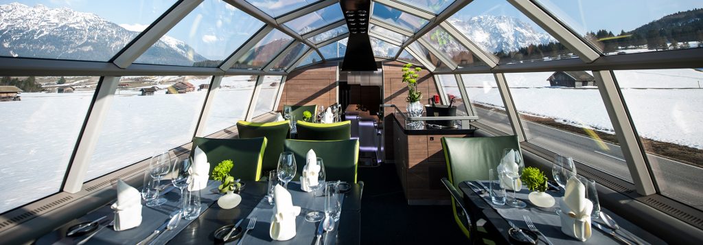 Fancy a candlelight dinner for 2 or travelling with your private group with a panoramic view as you travel on most of the European rail network? Well, RailAdventure offers this opportunity with the LUXON panoramic dome car.
