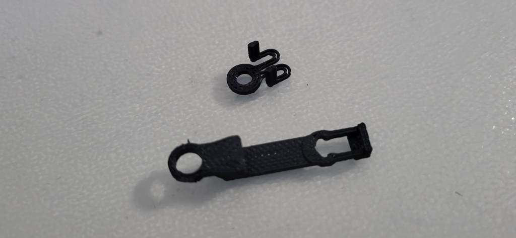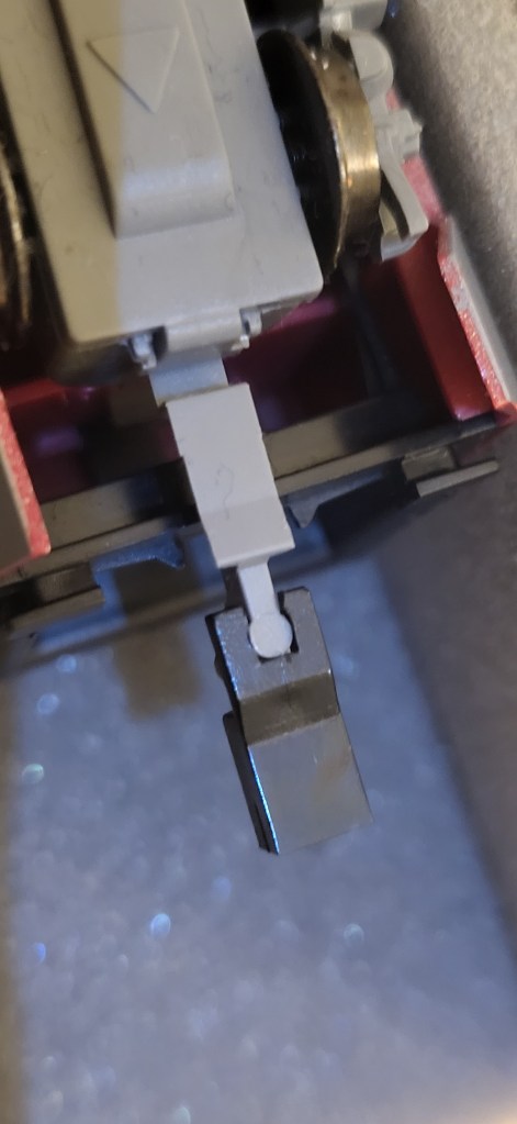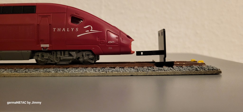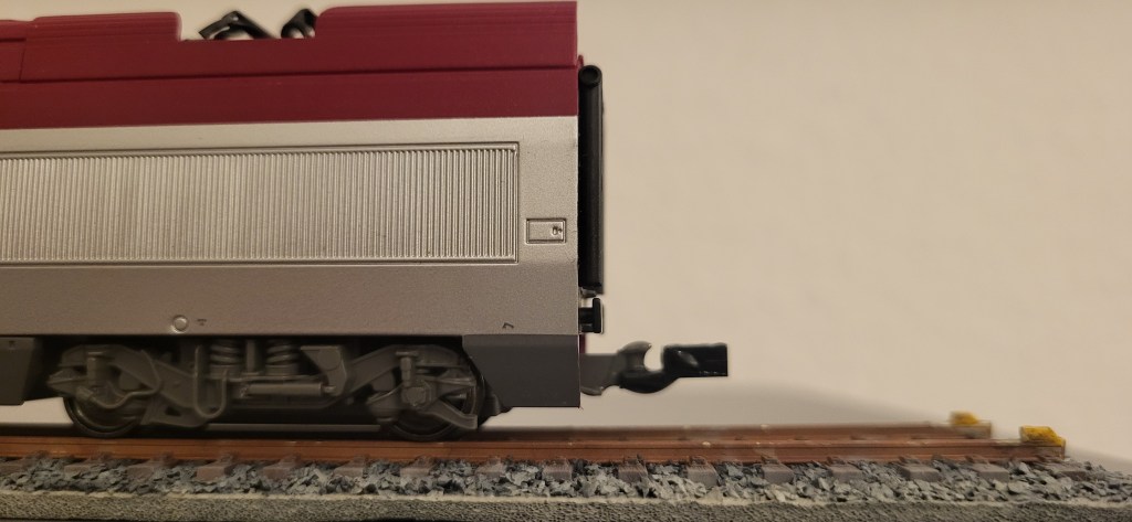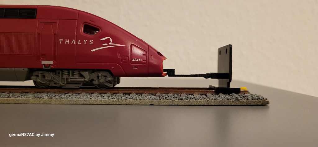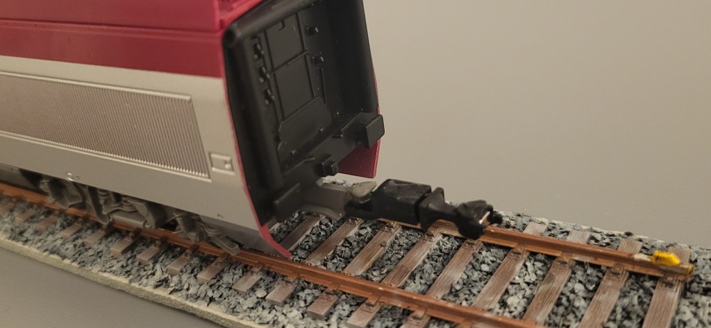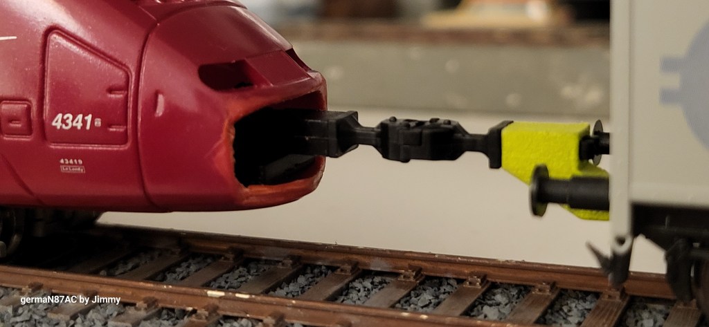 On Thalys trainset, the original couplings are different. On the power car, I need to make adjustments. Again, using the NEM socket height guide, I found the correct height on the original coupling. The end of the NEM socket had to be removed so that it would be attached to the Thalys coupling. Using epoxy glue, it will harden after 12 hours and leave a strong transparent bond.
