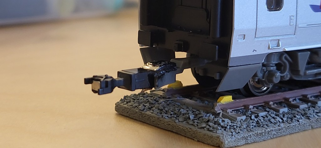Likewise, the 2-car trailing set, I used epoxy glue to fix them. Alligator clip is handy to hold the NEM socket while drying.