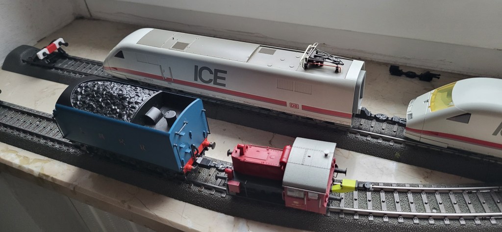 I have a couple of analog, non-running locomotives and trainset that I used as static displays on Loewenherz Railway Park. Since I am modelling RailAdventure, I wanted to convert them for special transfers, attached between barrier wagons. SYMOBA and Ebay-Mobadapter sell the NEM sockets in various sizes and lengths that fit my purpose.