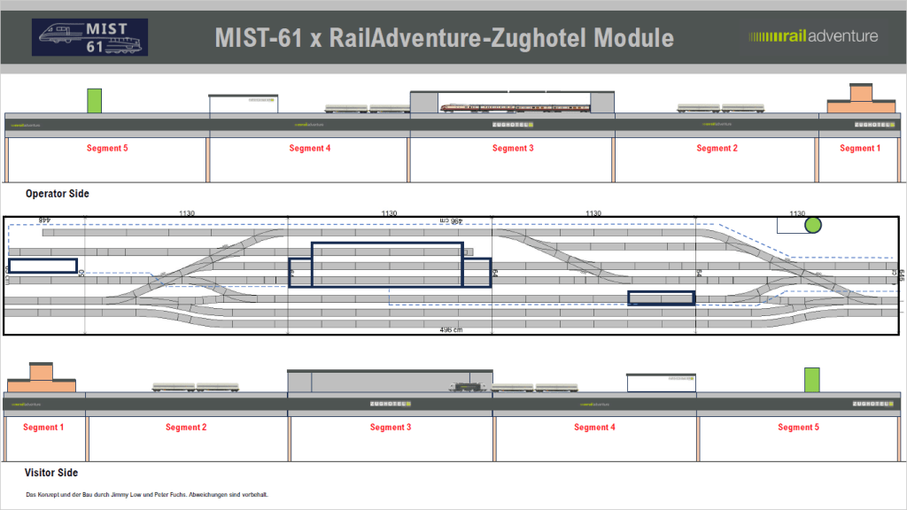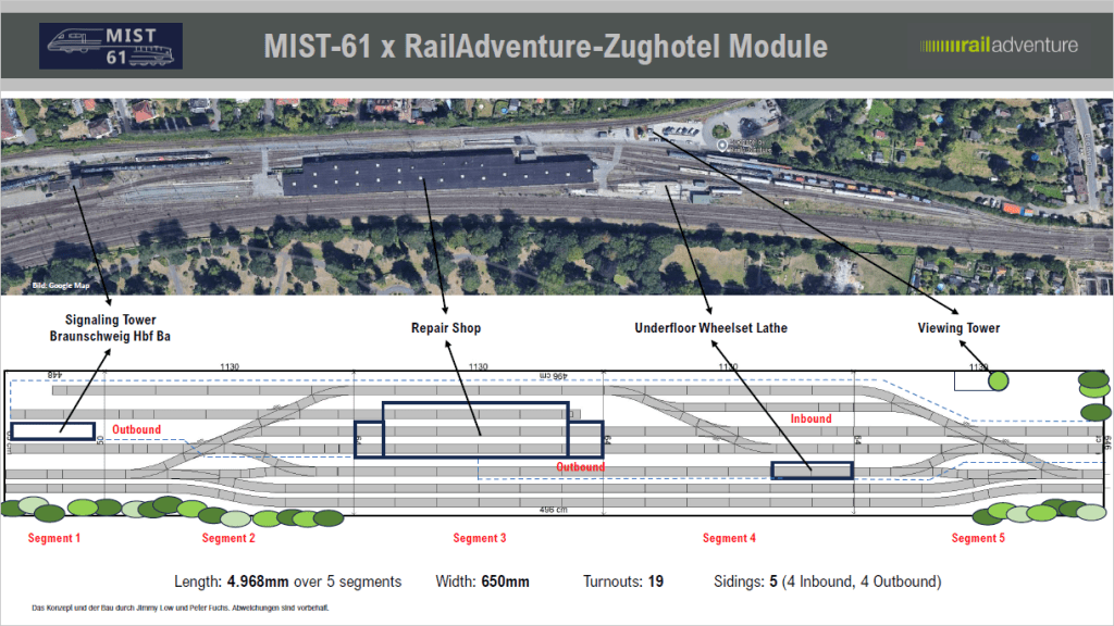 Peter, the master planner of MIST-61, created a highly accurate track layout based on an aerial image of the Zughotel in Braunschweig from Google Maps. After several rounds of discussion, we adjusted the track plan so that all modules would fit into my car’s trunk. The total length is nearly 5 meters, spanning 5 segments. The maximum width must not exceed 0.65 meters to fit in the trunk.