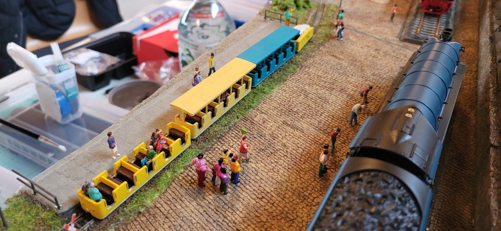 When I decided to build my first MIST-61 module, it came immediately to my mind to build an open-space railway park in the spa town Bad Niedrigsrode. That vision started with a concept sketch on 7th April 2022, a few months after I joined MIST-61. Construction began a few months later. I could not spend much time on the module, usually doing bit by bit 1-2 weeks before each operating session. Thus. after 3 years, on 22th March 2025, the realisation of that railway park – Loewenherz Railway Park Bad Niedrigsrode is finally fulfilled.