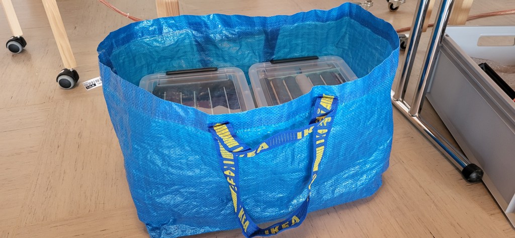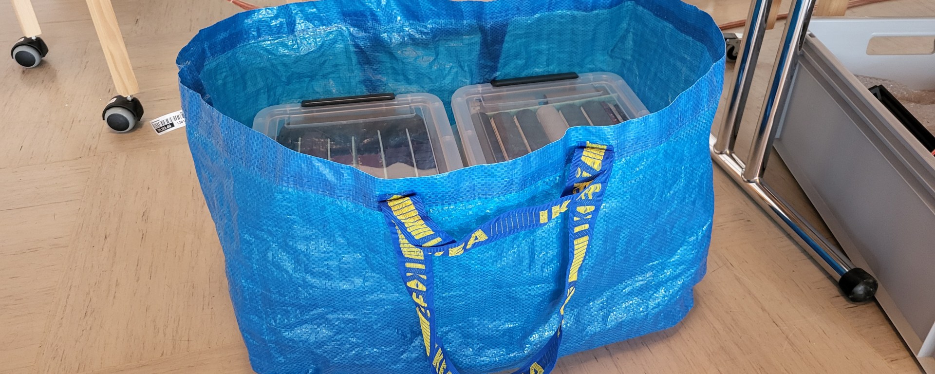 To transport these Citylife boxes, I used the IKEA blue bag. Each bag can hold up to 10 boxes. Easy peasy.