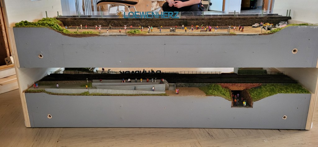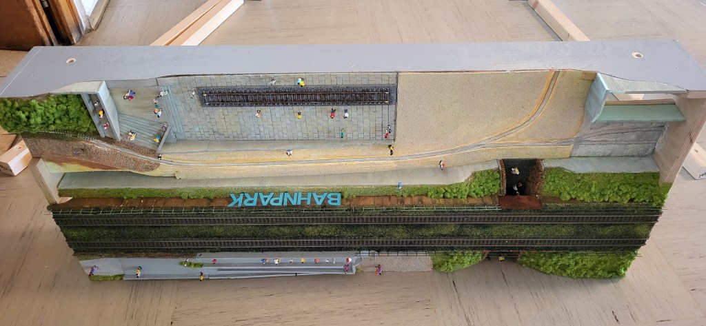Until now, I placed and removed my figures and model cars for every operating session. I was undecided whether they should be glued permanently on the modules. And now, ca. 100 H0 figures and model cars are now permanently attached on the layout using superglue.