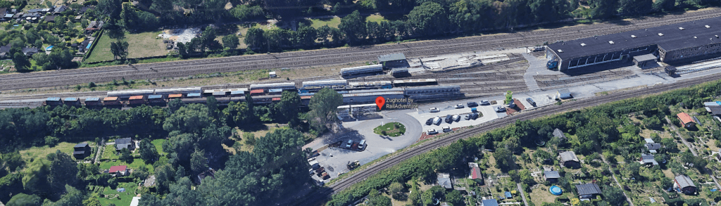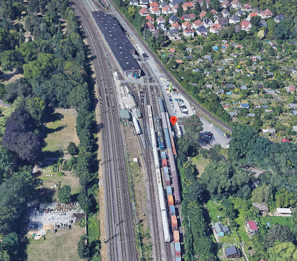 Zughotel is located north of Braunschweig central railway station, at the site of former DB Regio Braunschweig maintenance facility. Three mainline tracks run along the facility – two towards Wolfsburg and one to DB Cargo freight shunting facility.