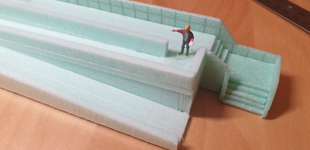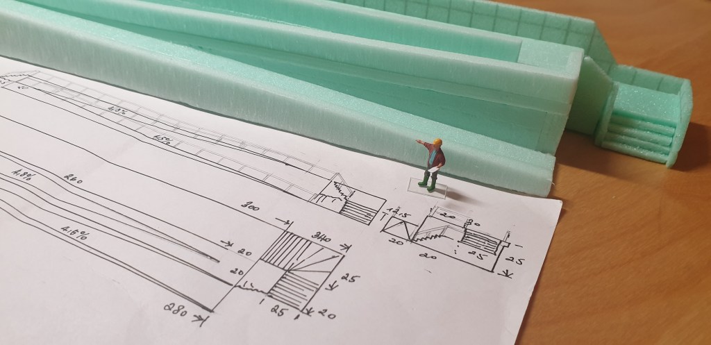 Technical drawing of the visitor vierwing platform and a prototype made from 2.2 and 5mm XPS foam